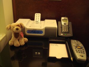 Our very hi-tech room. It comes complete with i-pod dock, DVD player, huge flat screen TV and other techy stuff.