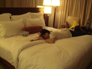 In our hotel room: miniD getting comfortable on the huge bed with many pillows.