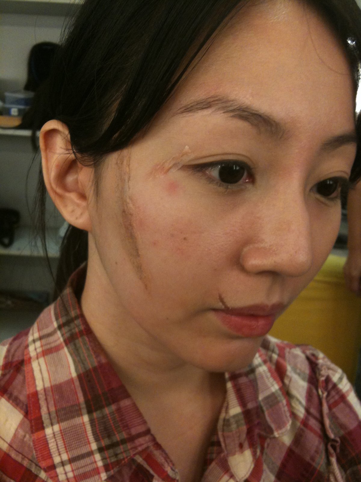 The scars are done by make-up putty and other special effects stuff and it’s darn painful to remove them from the face!! My skin is still red and sore from removing the scars yesterday. 😦 Ouch. Applying lots of calming creams and toners now to soothe it away.