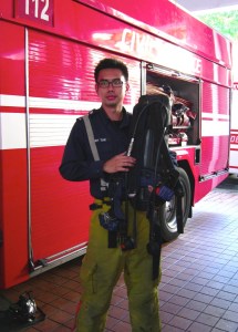 Trying out the water hose that puts out fires. It’s like a garden hose, but a million times stronger and heavier!