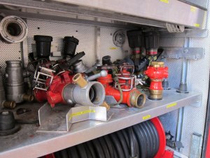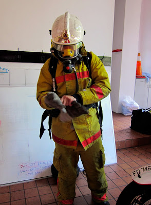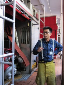 Here’s Captain Andy showing us his fire fighting and rescue equipment. He’s carrying the oxygen tank that every firefighter carries when going into a building to put out a fire. And it’s very heavy! Actually, most of the equipment on the fire engine is really heavy. You need to be really strong to be a firefighter. Apparently, there are also women firefighters. And they get no special equipment. They use the same stuff as the boys!