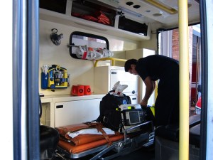 Here’s the interior of an ambulance with the paramedic showing us all the various life-saving drugs and equipment.