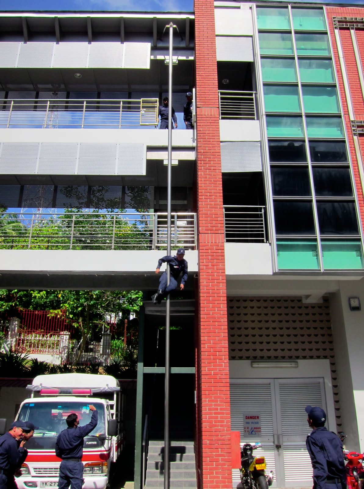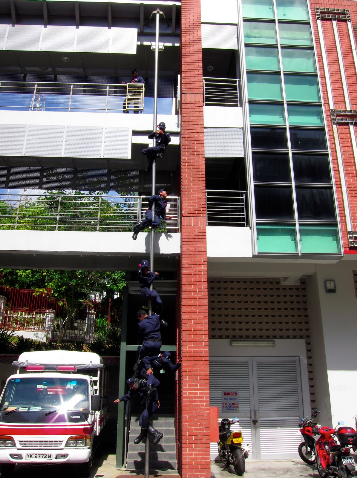 Firefighters demonstrating sliding down the pole.