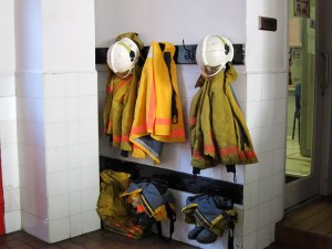 The gear that protects these firefighters. They are looking rather charred = used many times = saved many lives and property. Good job guys!