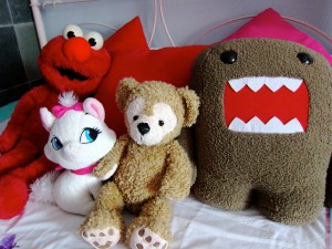 Snugglies on my bed. Marie cat and Duffy bear’s noses have been brutally attacked by Domo!