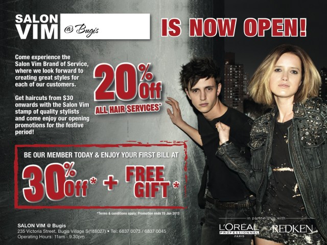 Salon Vim has just opened a new outlet at Bugis and is offering 20% off all full price hair services.