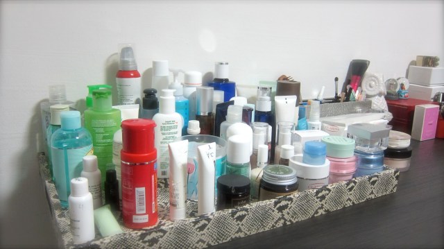 I was recently sent a bunch of skincare from Albion to try – the Skin Conditioner Essential, Exage White Crystal Milk I and the Skin Conditioner Essential Paper Mask. I am quite the beauty junkie (as you can tell from the photo below), but have sensitive skin (my skin breaks out or turns red easily), so I have to be very careful with the type of products that I put on my face.