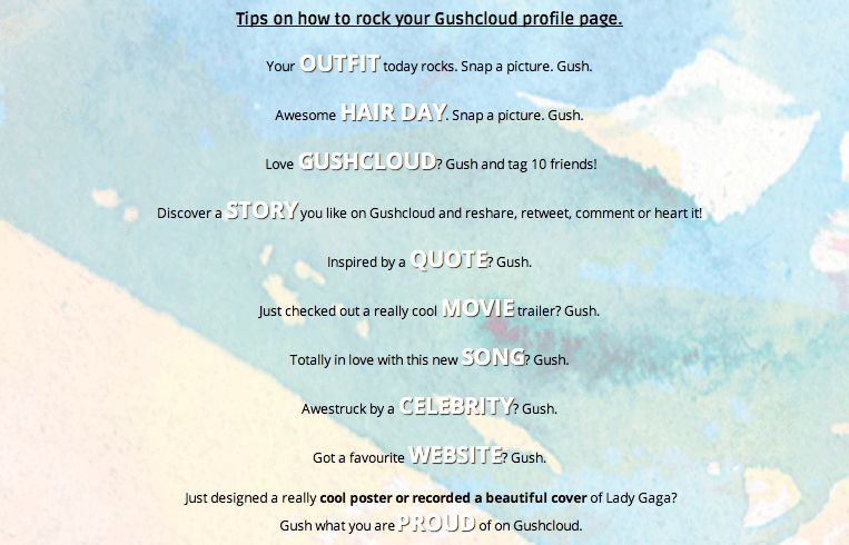 - Log on to www.gushcloud.com via Facebook or Twitter.