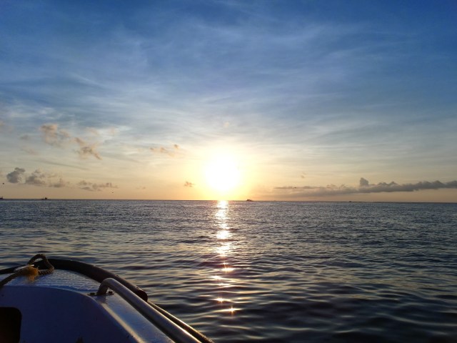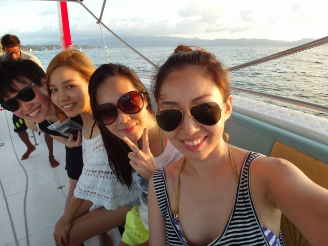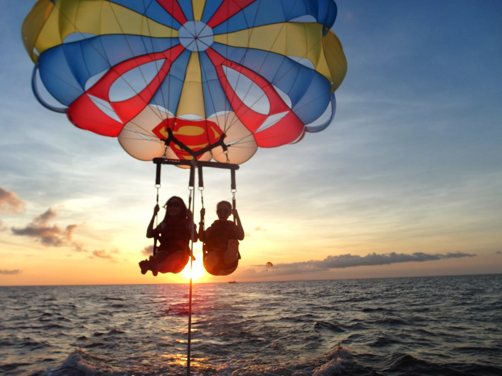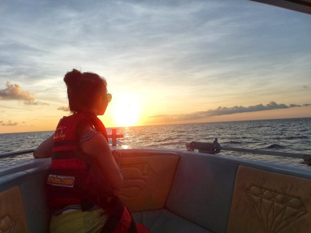 | Roomie, Kay Kay and I on a speedboat cruising into the sunset on our way to parasail. |