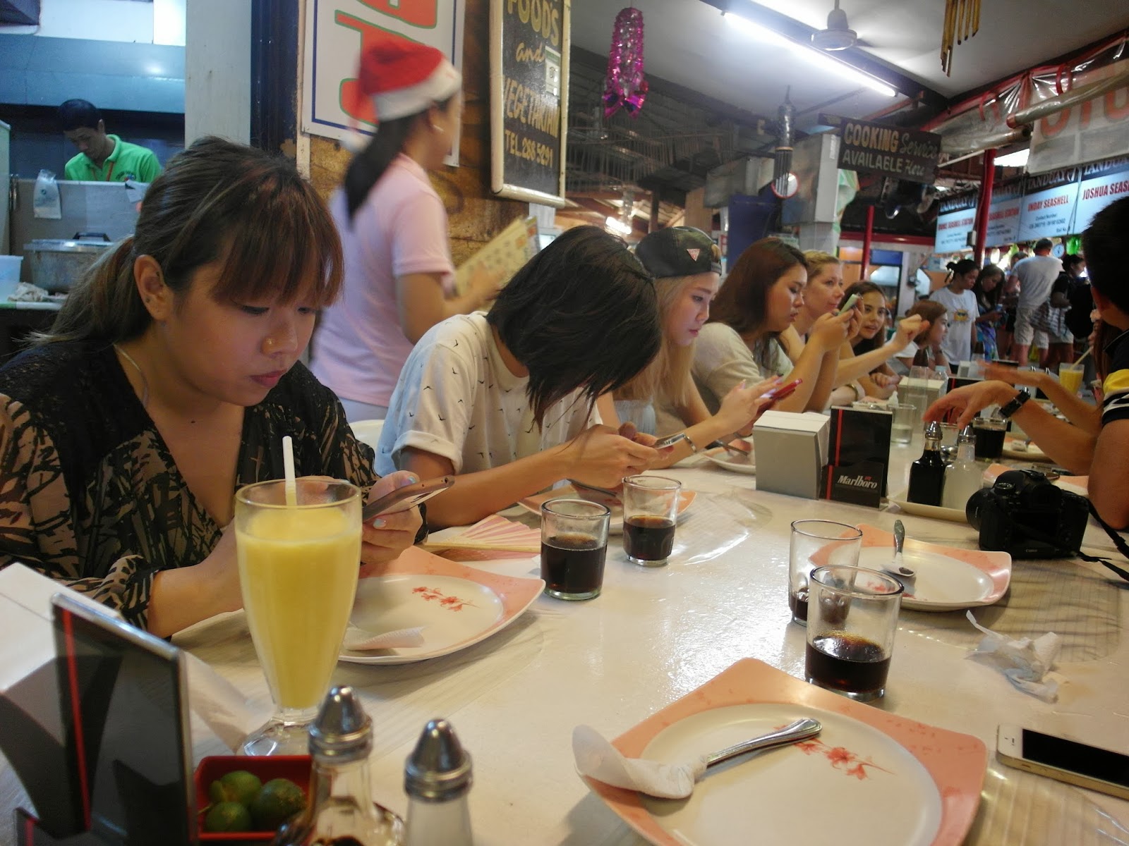 | Awaiting our food at Talipapa Market. No doubt a bunch of bloggers we are – we whip out our phones at every chance! |