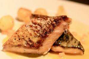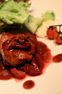 Roasted Duck Breast with Caramelized Sweet Potatoes, Foie Fras, Sweet Peas, Fruit Compote and a Pinot Reduction