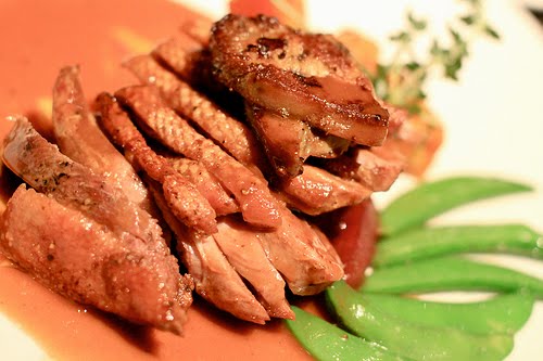 Roasted Duck Breast with Caramelized Sweet Potatoes, Foie Fras, Sweet Peas, Fruit Compote and a Pinot Reduction