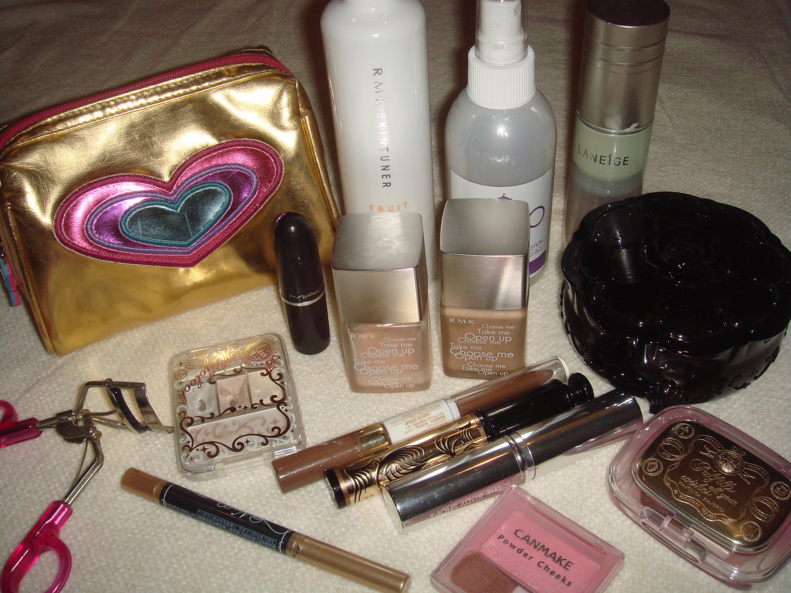 As for my face, I’ll usually slap on some RMK make-up base, followed by Laneige’s make-up base (the green one). I think the green really brightens the face and makes it fairer. Then, I’ll puff some loose powder on my face. I’m currently using Anna Sui’s…followed by blusher from….erm, Majolica again. 😀