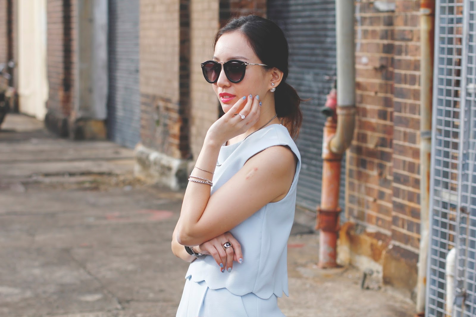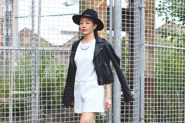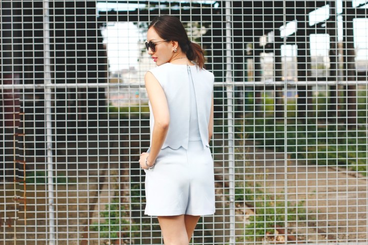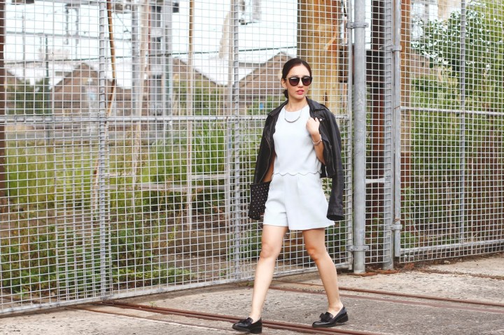 Here’s sharing one of my favourite outfits that I wore to #MBFWA in Sydney. I have a never ending love affair with playsuits and this gorgeous piece in powder blue was a love at first sight. How can you resist those scallop details! I dressed it up and toughened the look with a black leather jacket and patent ribbon bow flats.