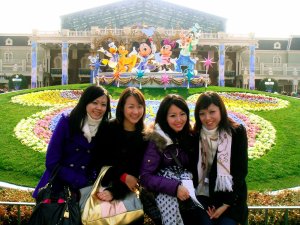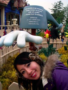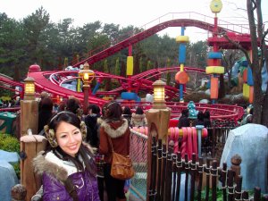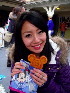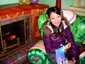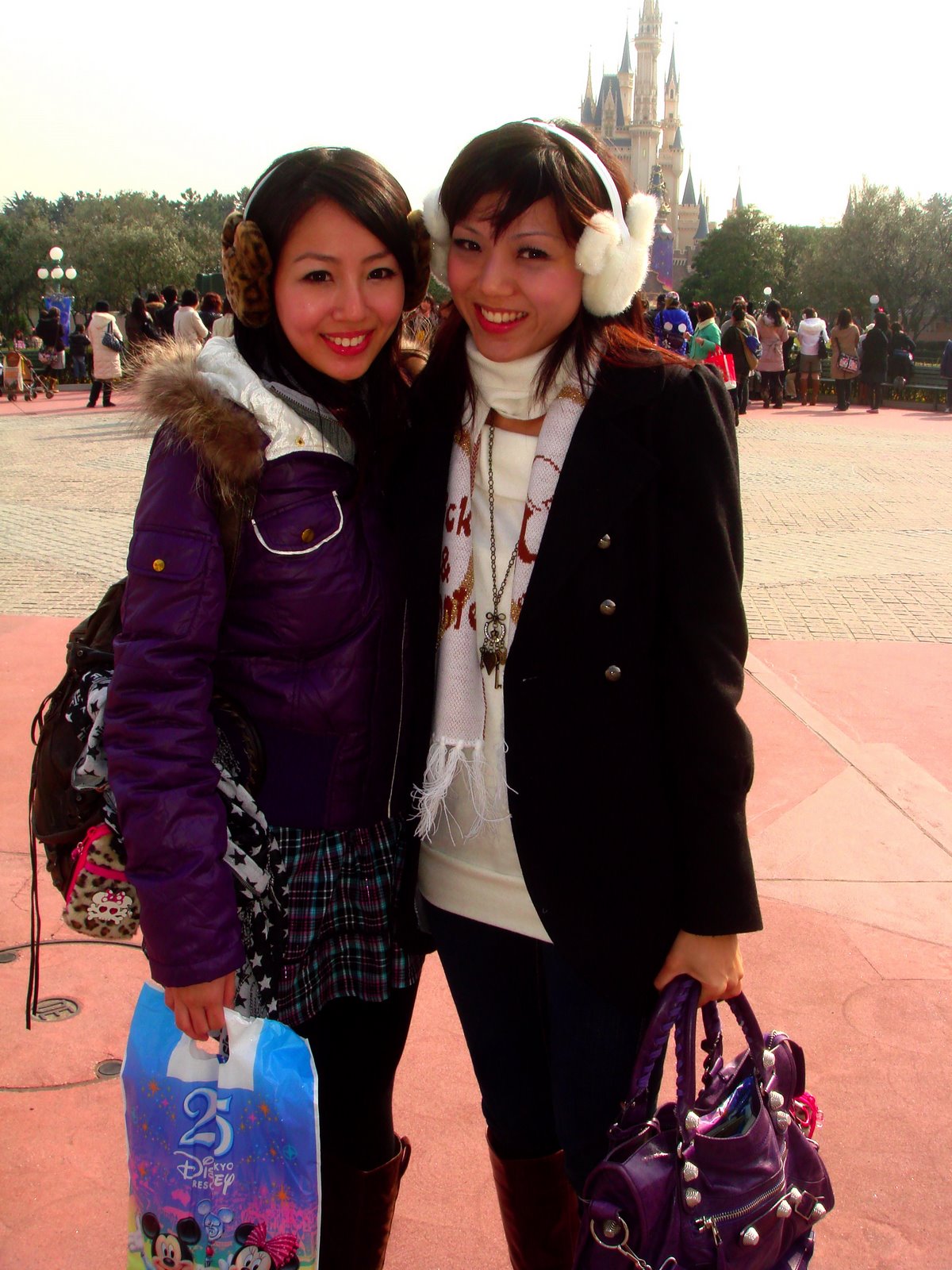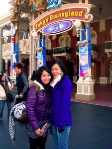 Cecilia and I with mickey ear-muffs and Disney castle at the back.