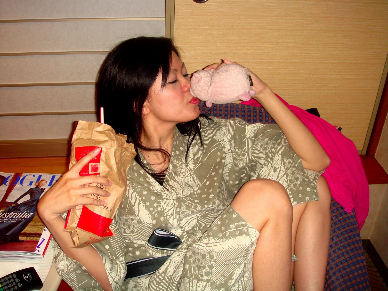 We packed MacDonald’s back to our rooms for dinner that night. Here’s kimono clad Candy and her little pig.